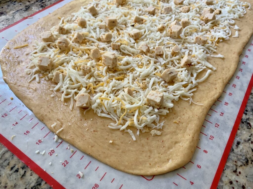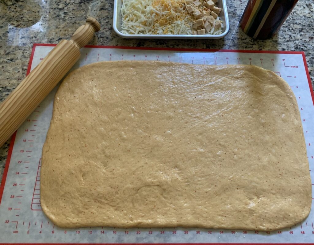 - When ready, transfer the dough to work surface and press to deflate. Next, roll out the dough into approximately 18" x 12".Then, distribute the cheese evenly over the surface of the dough, leaving about 1-inch border around the edges. Starting with the edge closest to you, roll the dough into a log, pinching the ends and edges to seal. Next, roll the log back and forth, applying gentle pressure, until it reaches 28 to 30 inches in length.