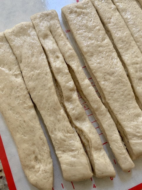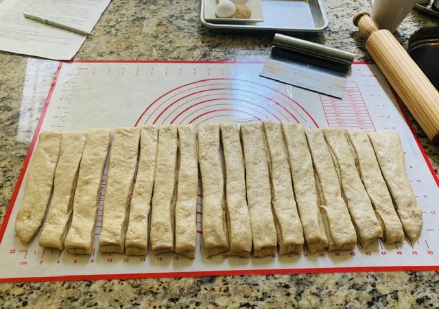 Fold the top half of the rectangle towards the bottom. Then lightly score the the dough into 16 equal strips. Use a sharp knife or pizza cutter to cut.