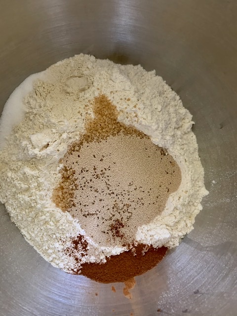 - Put the flour, 1/3 cup (6 Tablespoons) of sugar, yeast, cinnamon and salt into a large bowl (or your mixer). Mix till well combined. Set aside.