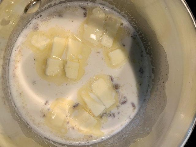 Once warmed, but not boiling, remove from heat and add 3½ tablespoons of butter into the warm cardamom milk.