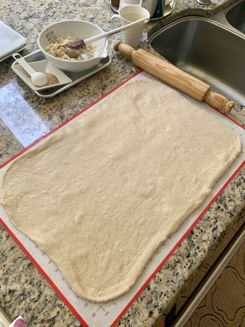 Roll out dough to roughly 15″ x 18″, with the long edge facing you. Then, carefully spread the prepared cardamom butter all over the surface.