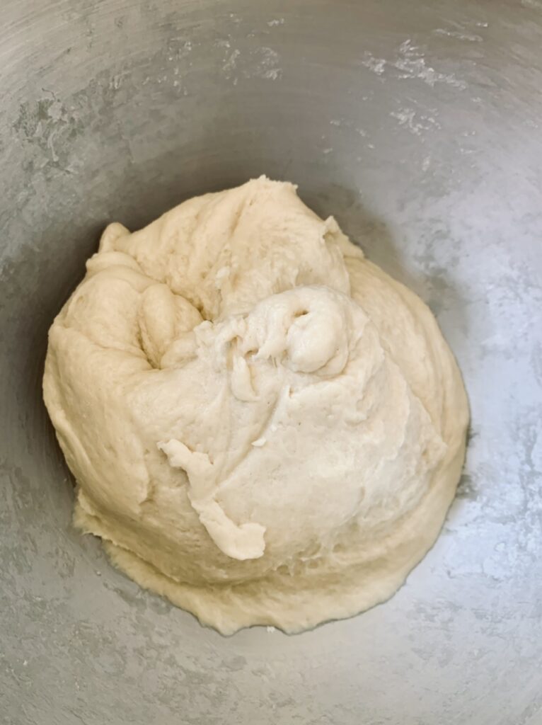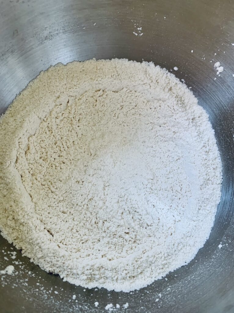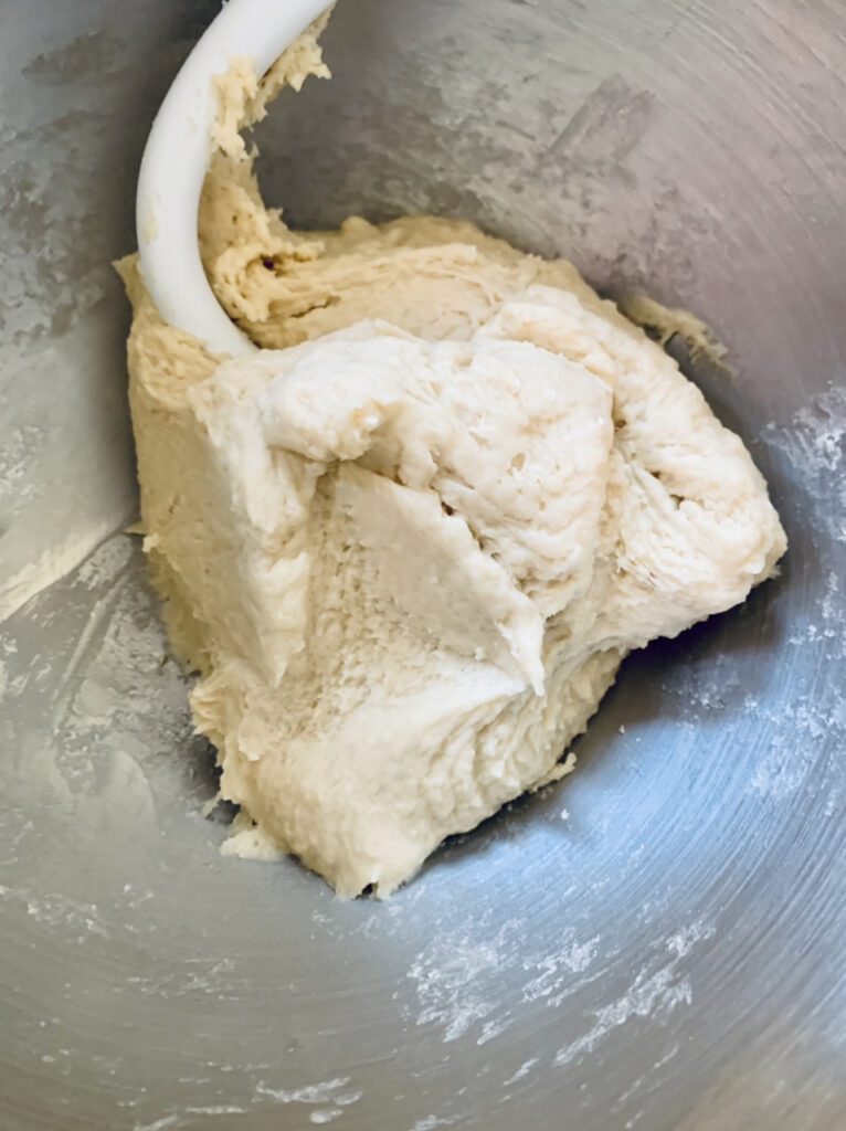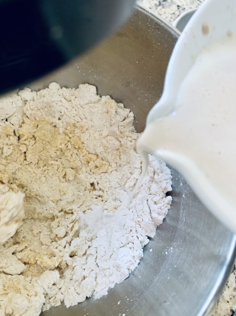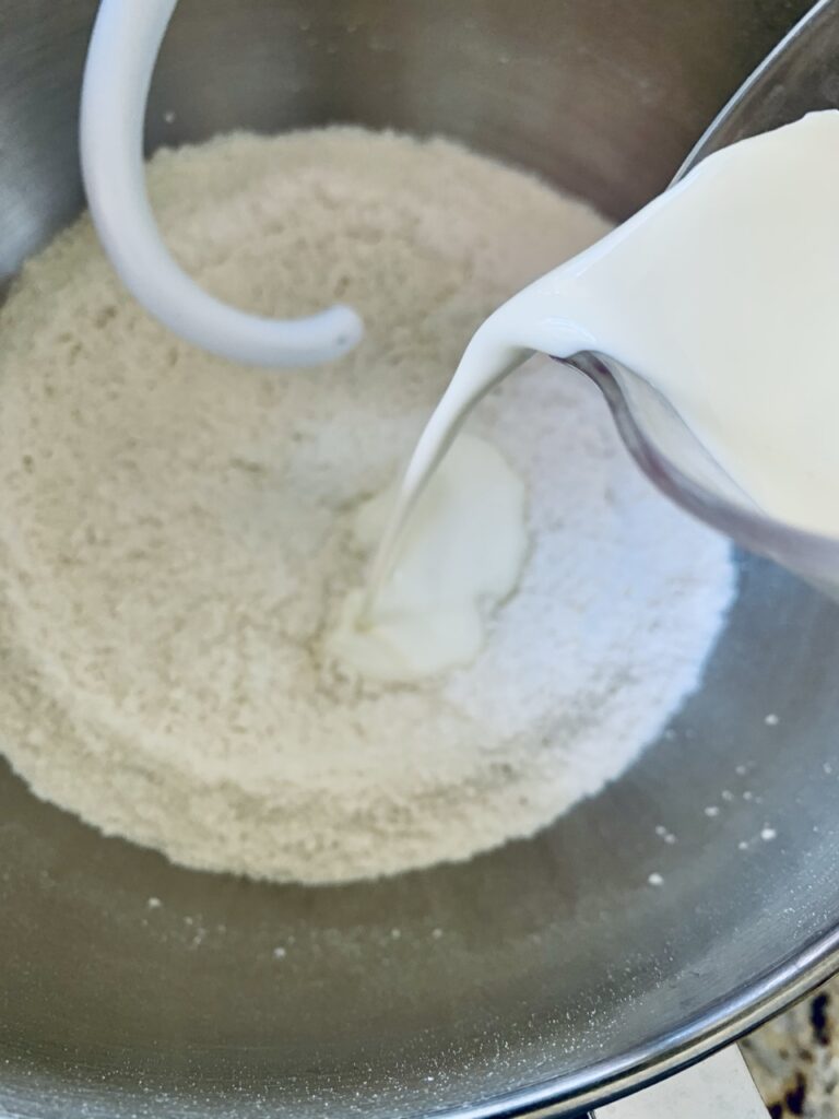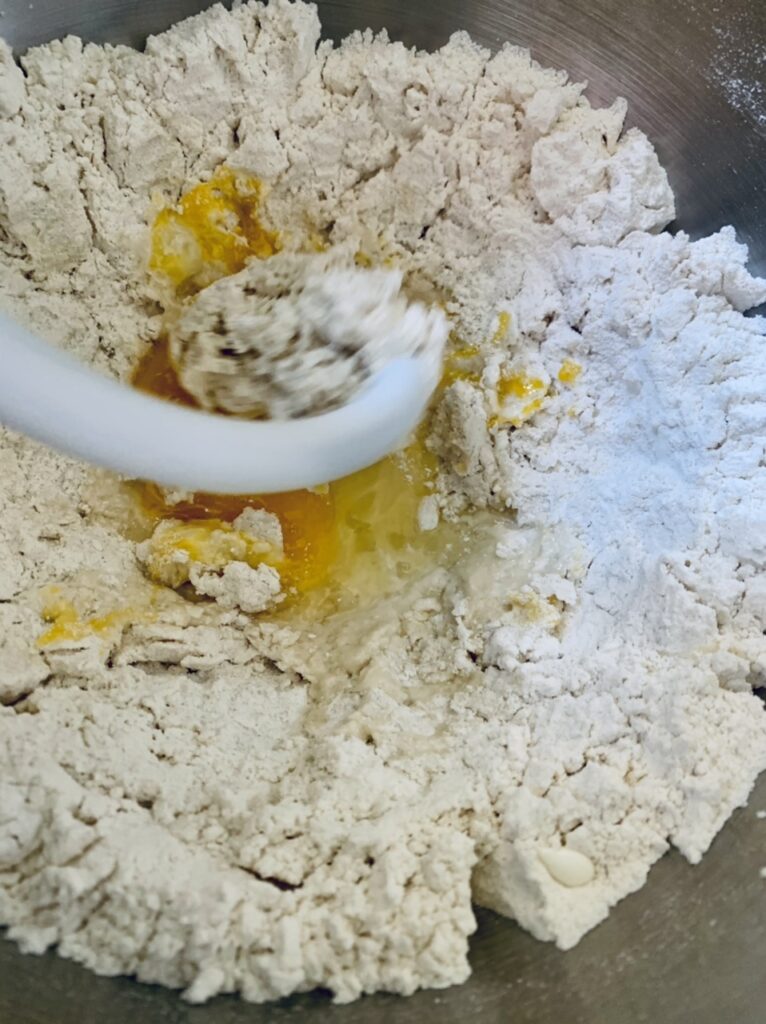 In the mixing bowl, whisk together the flour, salt and sugar until well combined. Then, add in the cream, egg and yeast mixture. Note: best to use these wet ingredients at room temperature for optimal results.