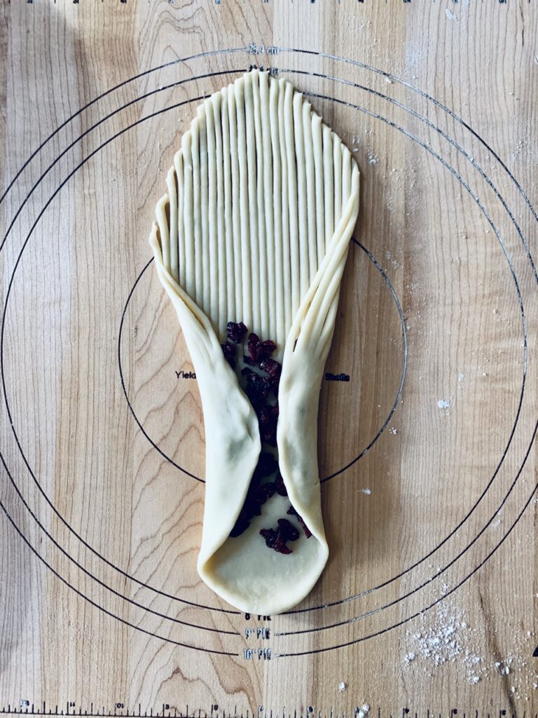 - Scatter about a tablespoon of chopped dried cranberries on the bottom uncut part of the dough. Fold in the sides and start to roll up the dough from the edge closest to you. Place the rolled up piece onto the prepared round pan with the seam side down. Repeat with the other 4 pieces of dough.