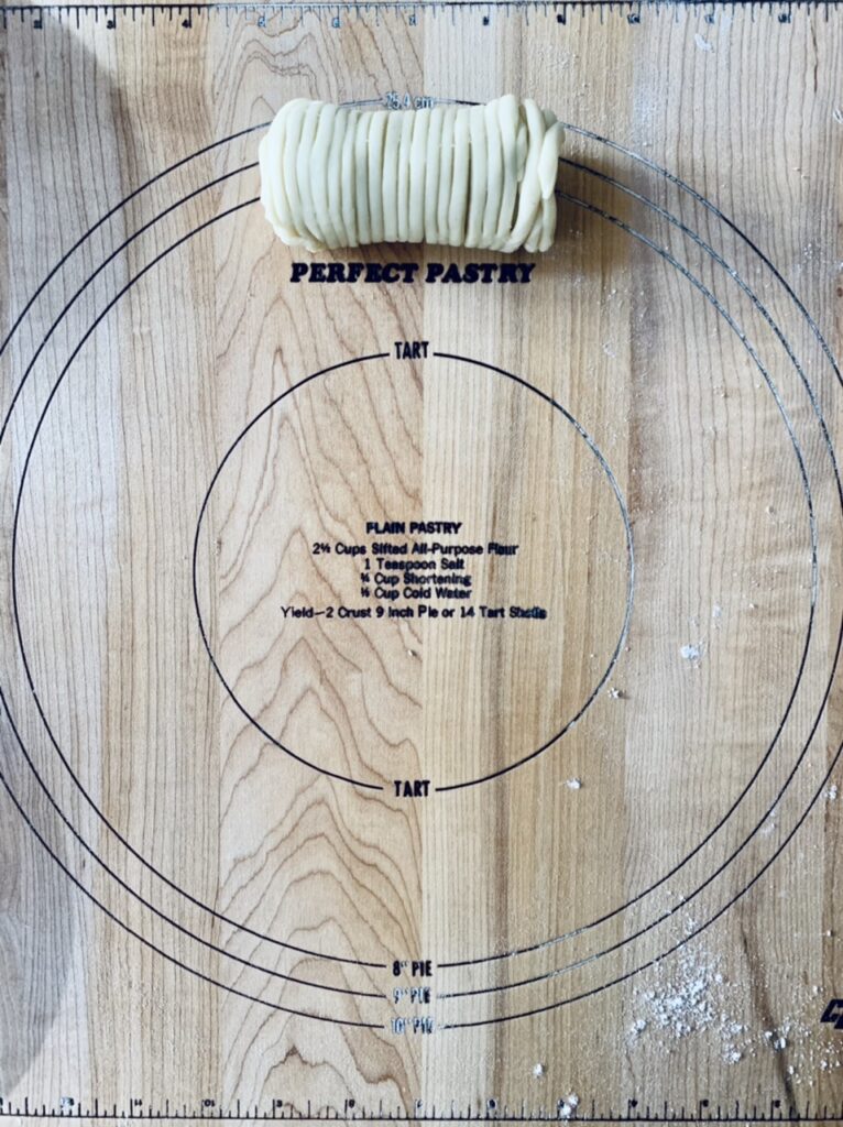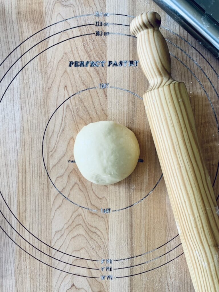 After resting for 15 minutes, take one of the dough balls, and roll it out into a long oval approx. 12″ (30cm) long by 5″ (12cm) wide. I used the lines on my pastry board as a rough guide. Tip: Very lightly score a line across the middle of the oval, as if you are dividing it in half. This will be a guide when you cut the top part of the dough.
