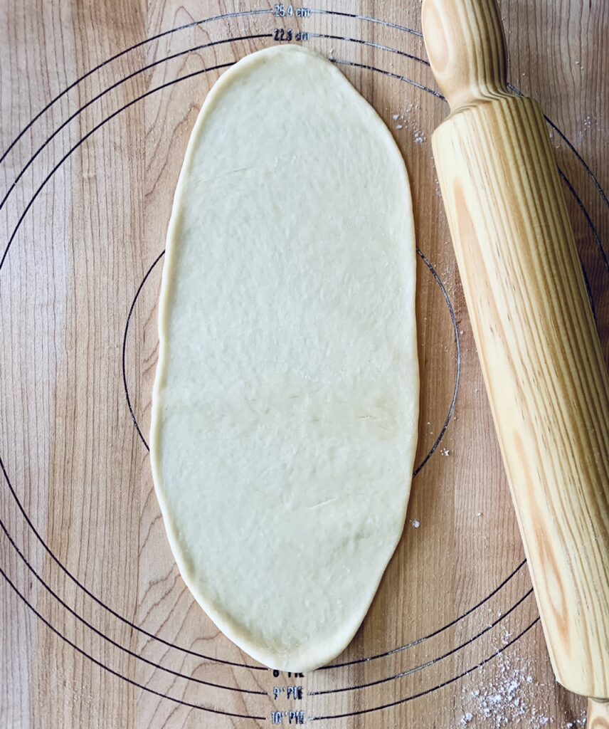 - Take one of the dough balls, and roll out into a long oval qpprox. 12" (30cm) long by 5" (12cm) wide.