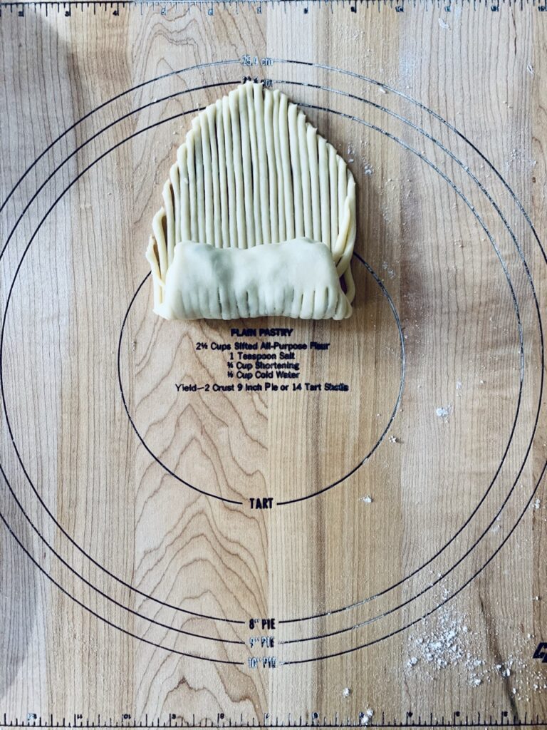 Then, using a very sharp knife or your bench scraper, cut long thin lines from middle to the top of the dough piece.