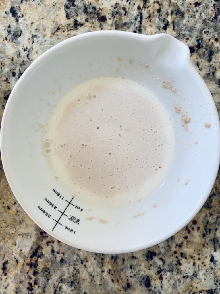 Let’s start by gathering all the ingredients. First, we bloom the active dry yeast by adding the teaspoon of yeast to warm milk. Stir and let it rest for 5 minutes. Note: This step is to make sure the yeast is still good. If after 5 minutes you don’t see any foaming on the surface of the liquid, toss away the mixture and try again. This happened to me during this bake, and I had to repeat this process. If the yeast is not active, your bread will not rise and you will end up with a flat and dense bread.