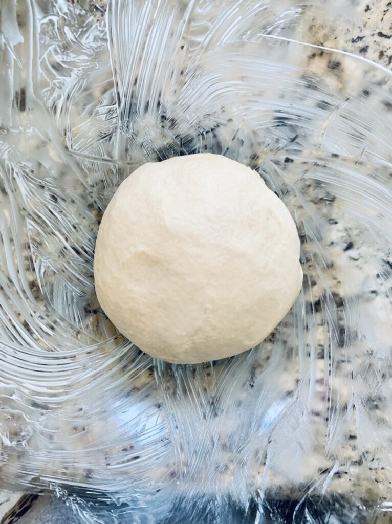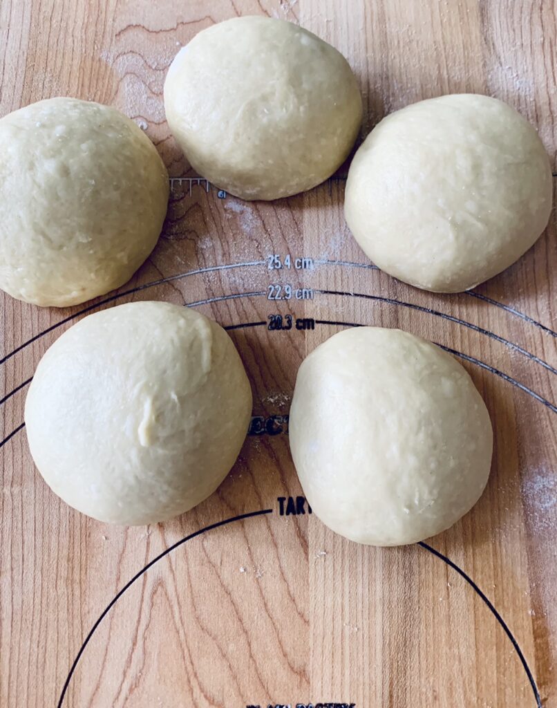 - Tip dough onto lightly floured work surface. Deflate the dough slightly. Divide into 5 equal pieces. Form dough pieces into balls. Cover and let them rest for 15 minutes.