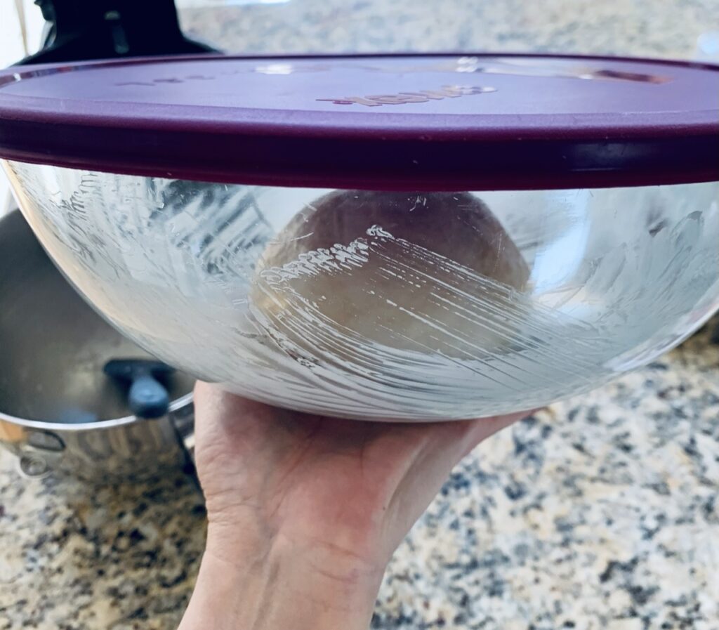 Cover the shaped dough with plastic cling wrap and let it rest for about 60 minutes until it looks pouffy. When waiting, preheat oven to 350°F (177°C)