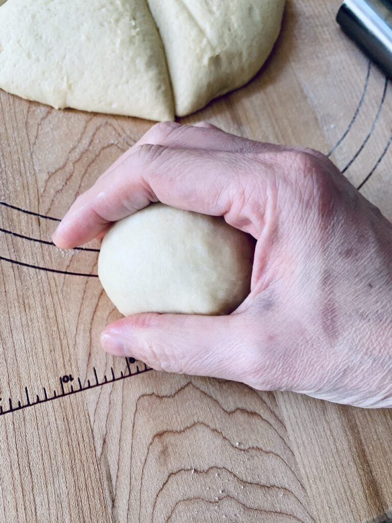 Next, scatter about a tablespoon of chopped dried cranberries to the bottom uncut part of the dough. Fold in the sides and (confidently!) start to roll up the dough from the edge closest to you. Placed the rolled up piece onto the prepared round pan. Rest the rolled up piece on its seams. Repeat with all the other 4 pieces of dough.
